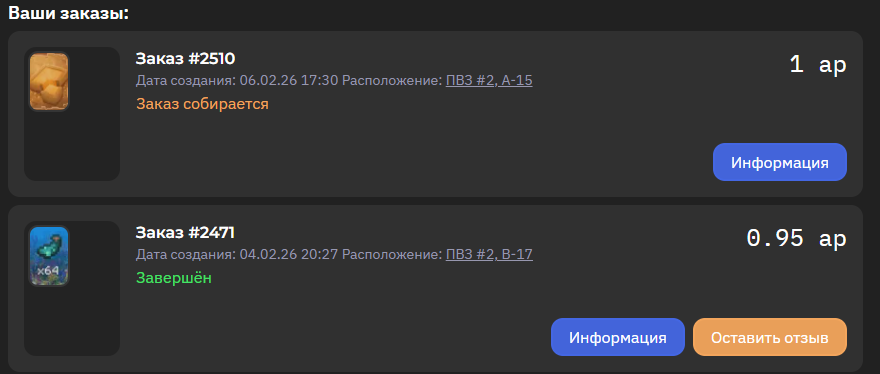 Оплатив заказ вас перекинет во вкладку «Ваши заказы», где доступна подробная информация о заказе и отслеживание её статуса.