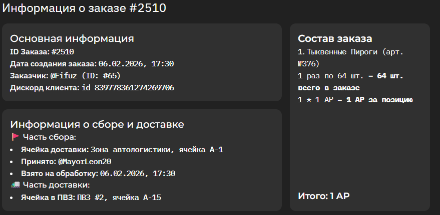 * Ожидает доставки — авто-логистика собрала ваш заказ, а сам заказ ожидает доставки курьером.