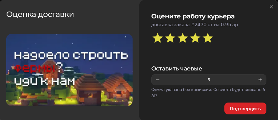 После успешной доставки вы можете оставить отзыв о товаре, а также при желании оставить чаевые курьеру.