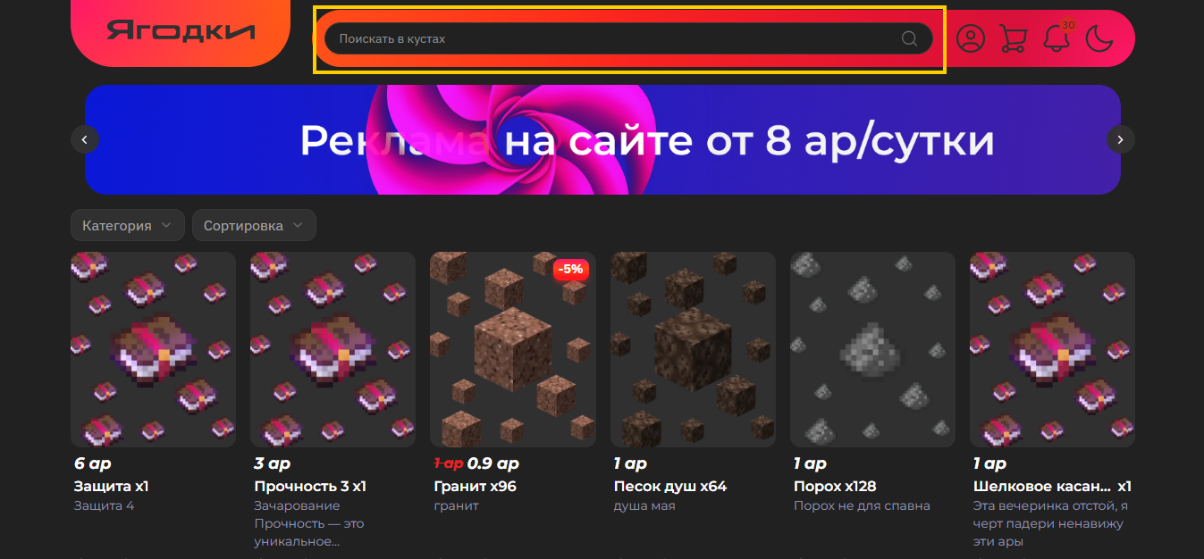 Для начала на главной странице выберите нужный товар или воспользуйтесь строкой поиска.