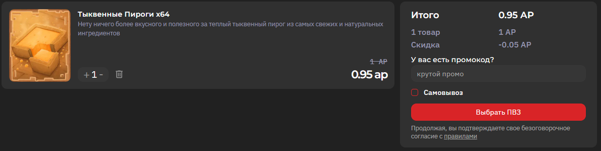 В этом же окне вы можете ввести промокод, который даст определённую скидку на заказ, а также выбрать на карте ПВЗ, куда впоследствии курьер доставит покупку.