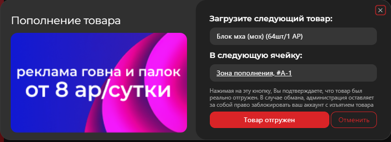 Откроется окно с информацией о том, в какую бочку необходимо загрузить товар. Сами бочки находятся в здании пополнений в центре логистики «**Ягодок**» по координатам **0 130 -75**, на **жёлтой** ветке в аду. Загрузив товар в бочку, нажав «Товар отгружен» и дождясь проверки логистом товар пополнится и отобразится в магазине.