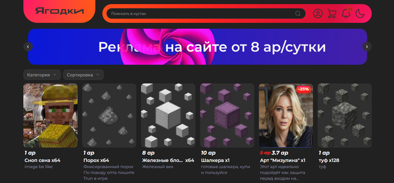 <kbd>**Ягодки**</kbd> — крупная и единственная площадка для торговли предметами на сервере DMC. Сайт позволяет быстро и удобно совершать сделки между игроками.&#x20;